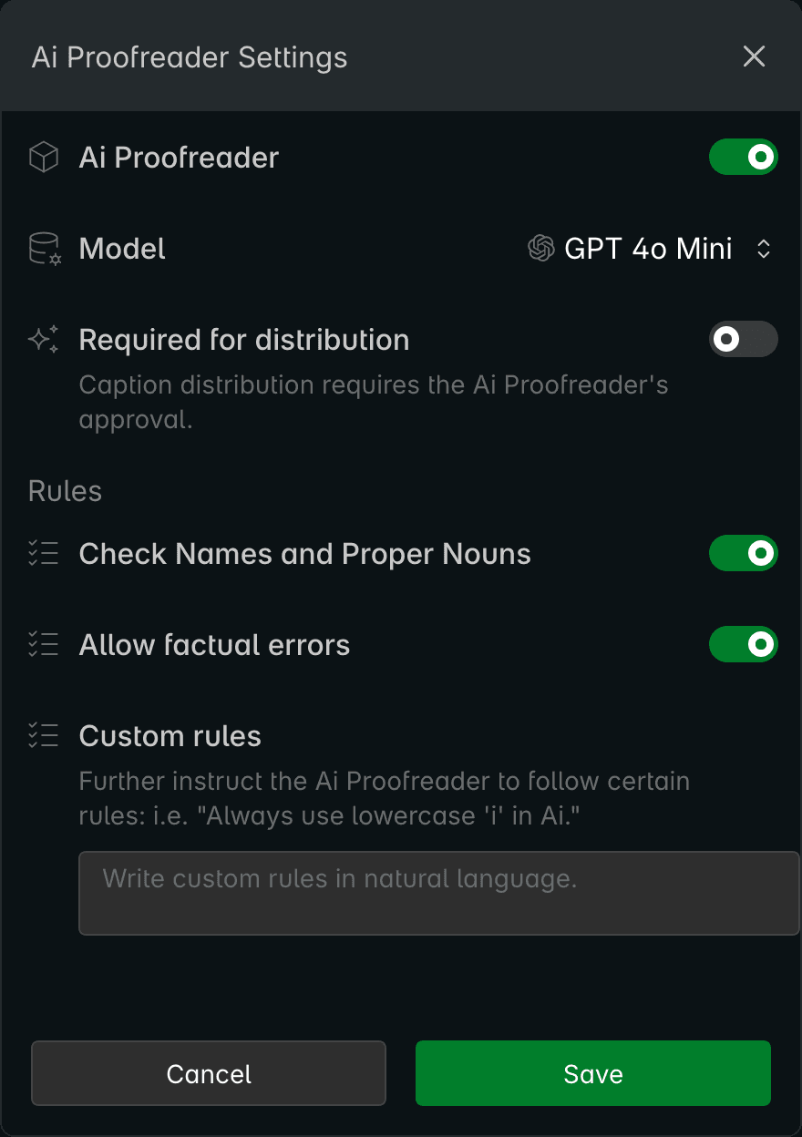 We work with world's leading LLMs to provide a fundamental model for your proofreader. This ensures large language compatibility, generic world knowledge, and applying a set of rules to the captions to ensure accuracy.